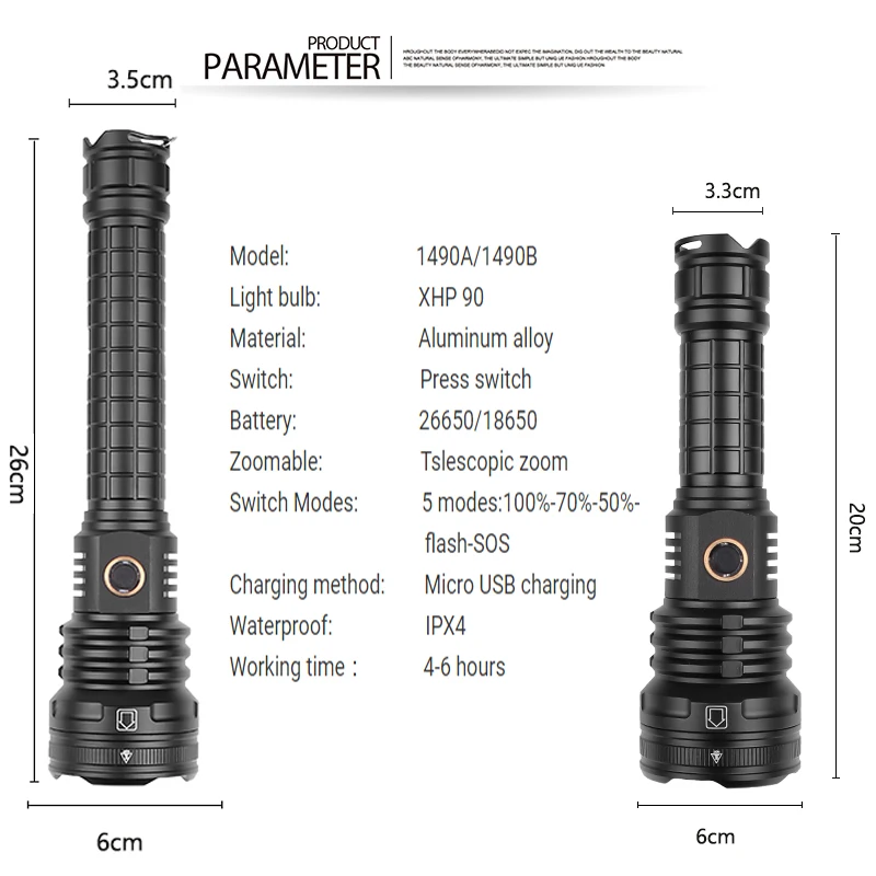 Product Name: Linterna Táctica LED XHP90.2, Linterna De Caza Con Zoom XHP90, Superbrillante, Resistente Al Agua