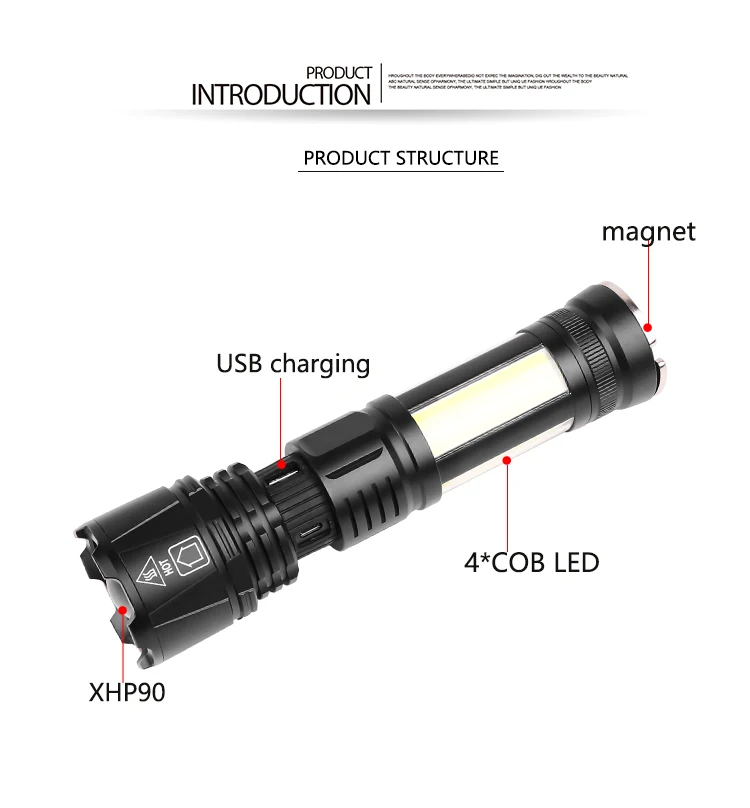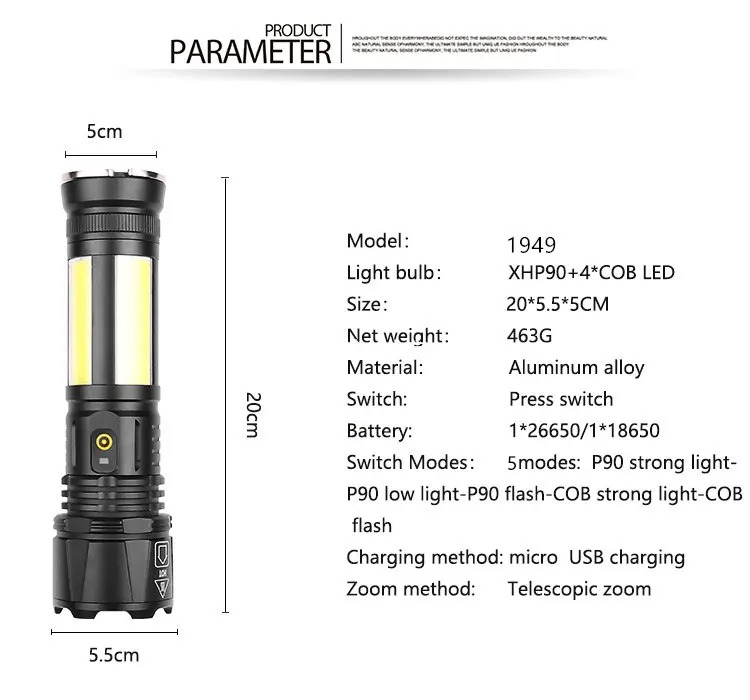 Product Name: Linterna Táctica Recargable Por USB, Luz Lateral Con 5 Modos De Iluminación Led, Batería 2021, XHP90, 26650