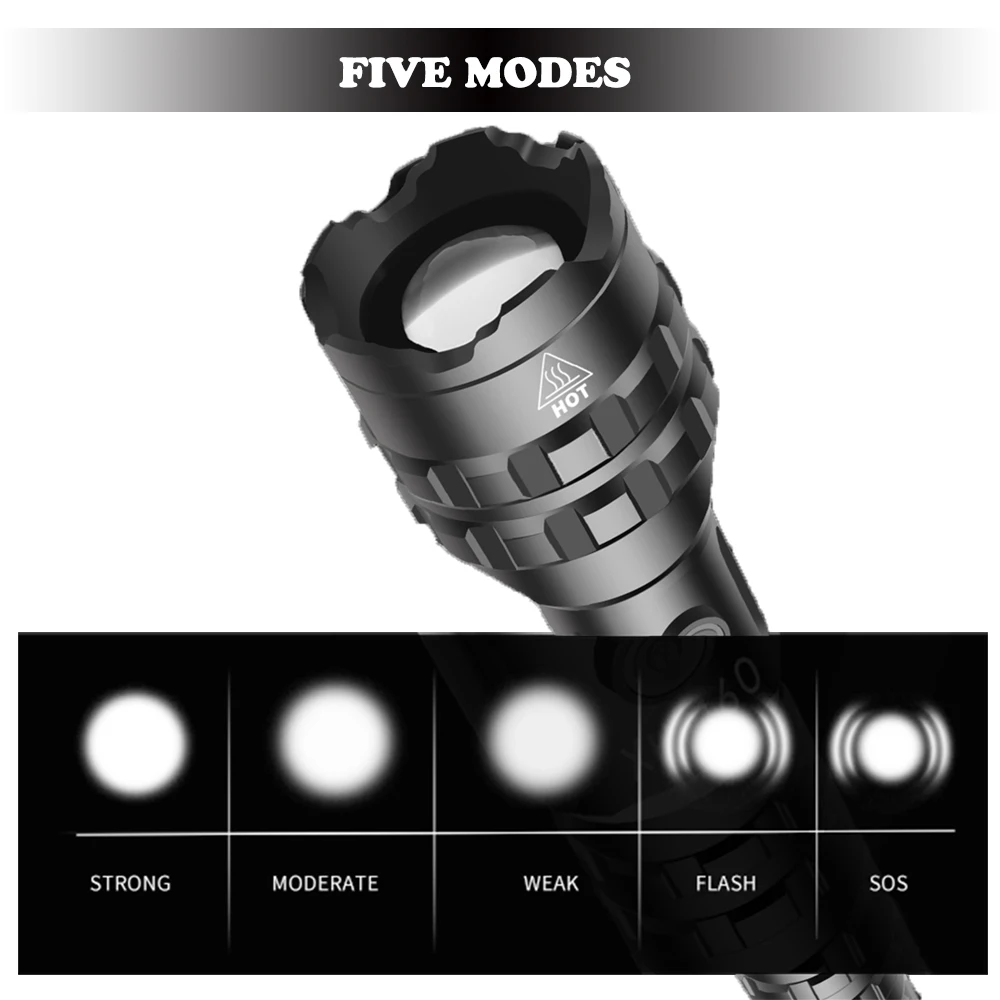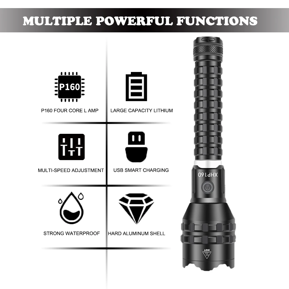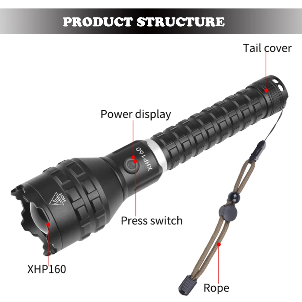 Product Name: XHP160-potente Linterna LED De 4500Lm, Recargable Por USB Tipo C, IPX4, Linterna Con Zoom Telescópica Impermeable, 5 Modos Por 26650