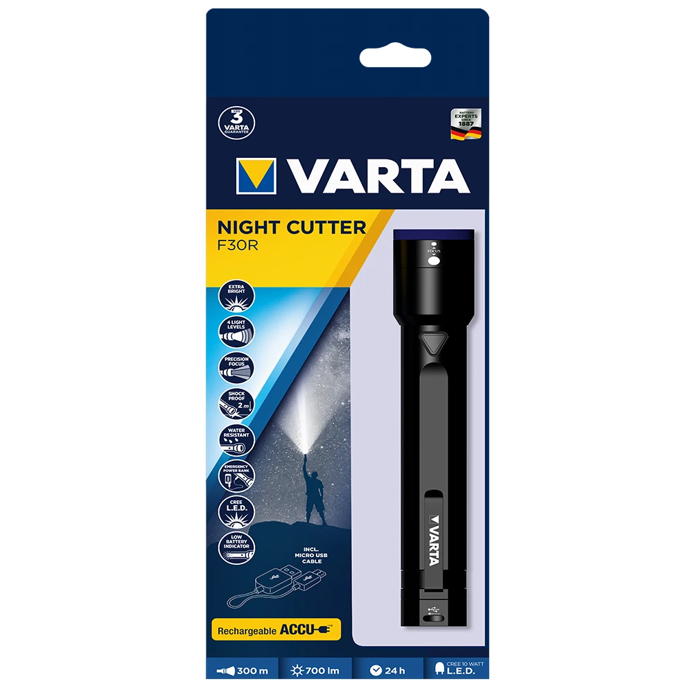 Product Name: VARTA Night Cutter F30R Linterna Prémium Recargable Y Batería Externa (2600 MAh), 0.1 W, Incluye Cable De Carga Micro-USB, 4 Modos De Luz, Alcance De 700 Lúmenes, 22,5 X 3,4 X 3,4 Cm [Clase De Eficiencia Energética A]